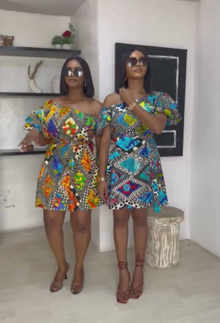 It's made of African print 100% cotton material, hand crafted. It's fully lined with pockets and drop shoulder sleeves. The belt is detachable for a fit and flare look