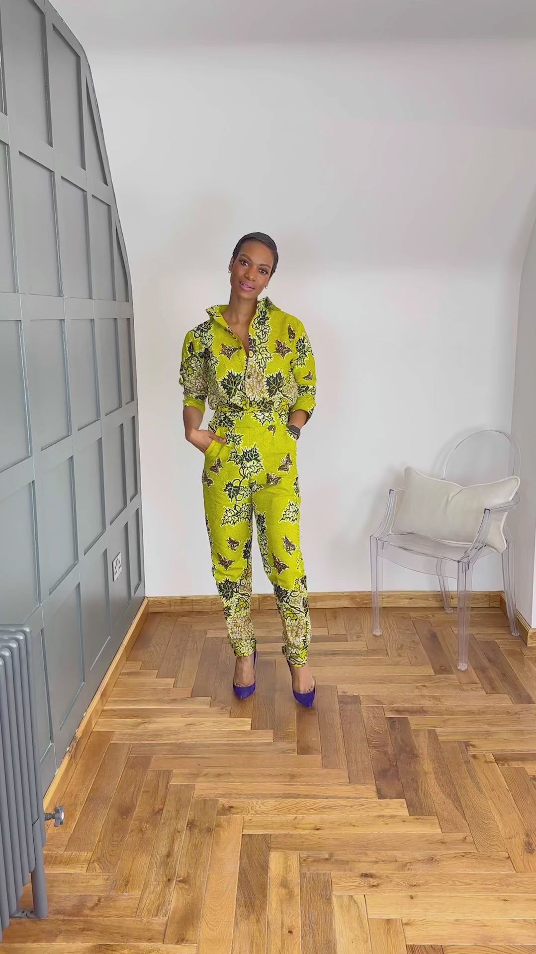 It features a button down shirt with matching pants. The pants have a back elastic and zipper for maximum comfort and style. Pockets? Yes please. The fabric has little to no stretch; sizing is true to fit.