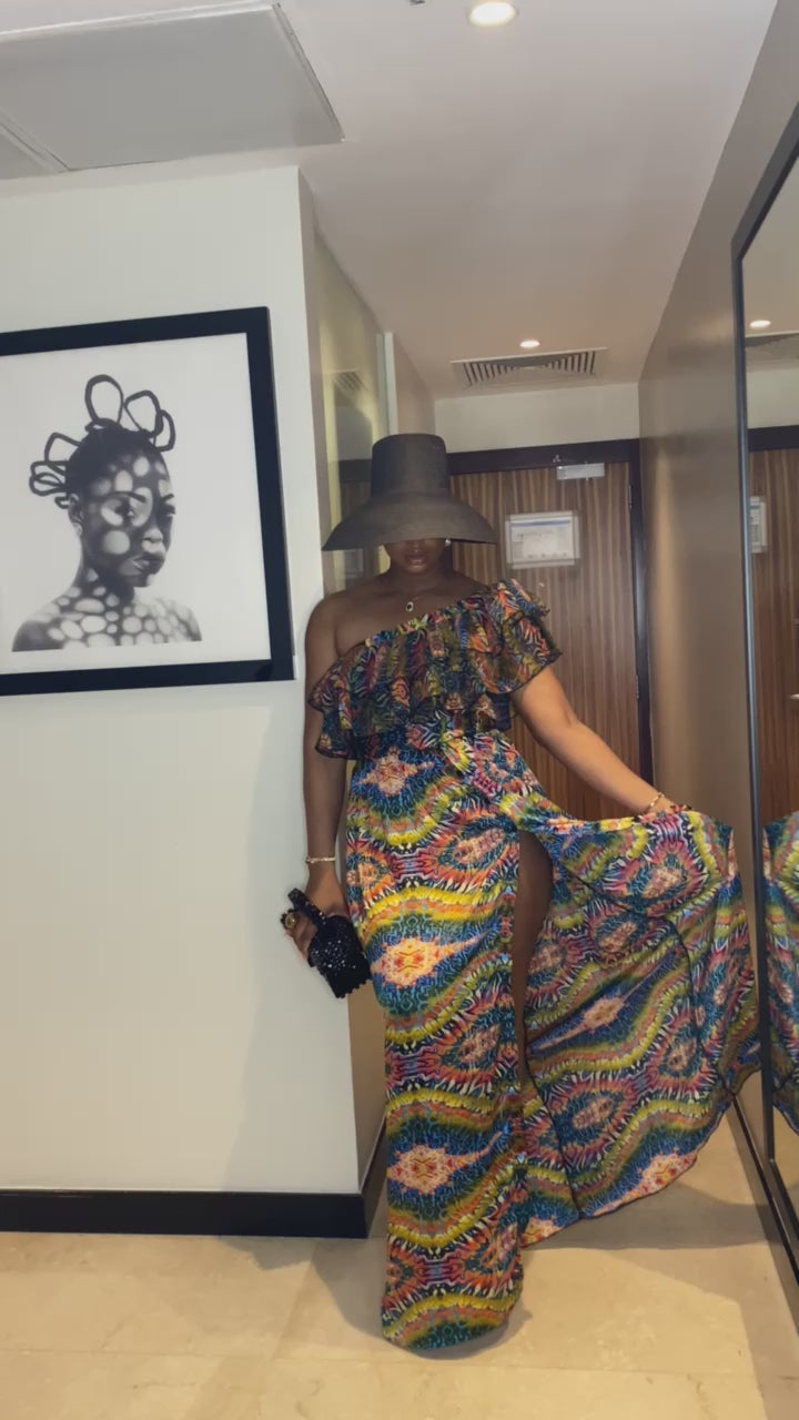 Each dress is cut individually and handmade with our printed soft silk and chiffon combo. The top frill part is made with chiffon and the skirt part of the dress is made with soft silk. Shut with a long back zipper. The side slits go high up and also have the option to close with the added buttons. Yes to pockets, pockets, pockets, to complete the look. Zanzibar is a vacation must have 😍. Style with a bright coloured fedora for the dramatic flare.